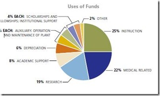 Tuition contributes less than a sixth of its sources and instruction forms a fourth of its expenditures.